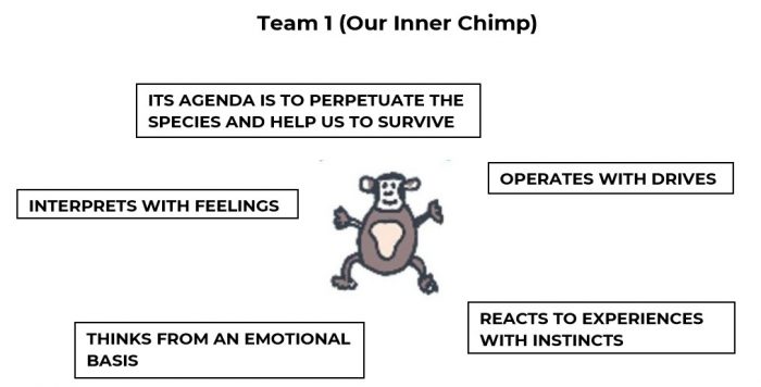 This team function in our minds is very similar to that of a computer: we can programme it by inputting data – i.e. beliefs and behaviours – that we find constructive. We then interrogate it when we’re faced with a situation, and it advises the Chimp and Human when we’re trying to make a decision of what to do/how to act.